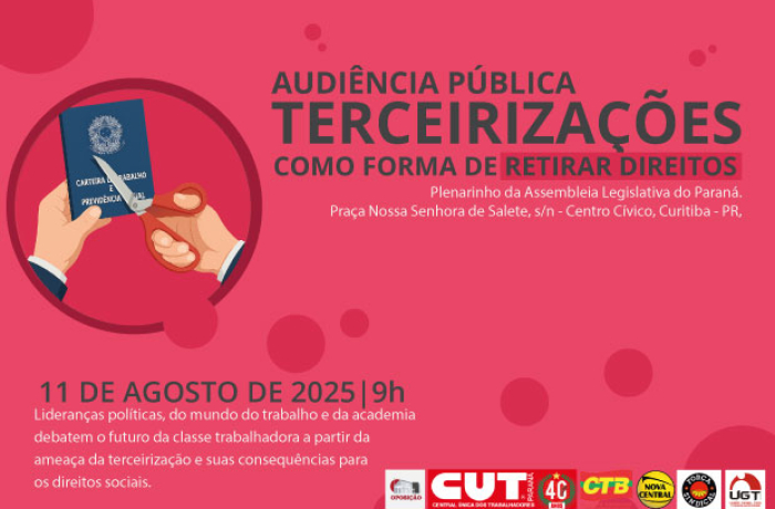 Na segunda-feira (11), a partir das 9h, o Plenarinho da Assembleia Legislativa do Paraná receberá uma importante audiência dedicada ao debate sobre a terceirização e seus reflexos diretos para a classe trabalhadora. As condições de trabalho e os problemas acarretados, do ponto de vista da saúde, mas também financeiro, estão no centro dos debates.