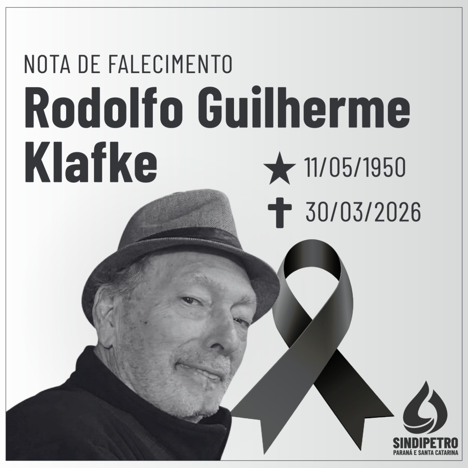 O Sindipetro PR e SC lamenta informar o falecimento do petroleiro Rodolfo Guilherme Klafke, aos 75 anos, ocorrido nesta segunda-feira (30), em Sapucaia do Sul (RS).