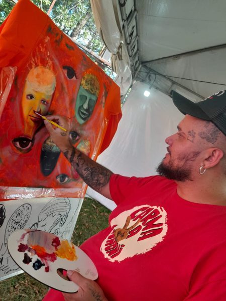 A agenda do dia também incluiu a presença do artista plástico Vátto, representante do Movimento Popular por Moradia do Paraná e da Escola de Samba Rosa do Povo. Em apoio à greve da categoria petroleira, o artista promoveu uma oficina de pintura coletiva em jalecos, transformando a tenda grevista em espaço de expressão cultural e resistência.